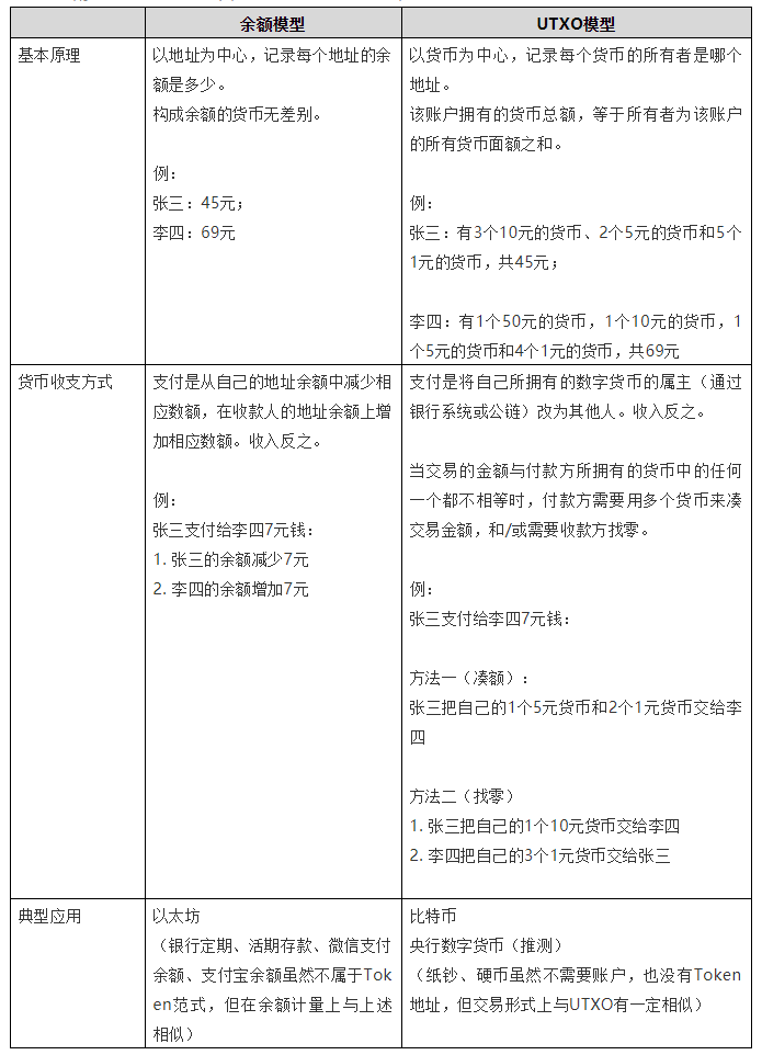 比特币、以太坊等区块链虚拟货币则属于Token范式,对用户高度开放,任何人只要根据数字签名算法生成一个公私密钥对,就可以拥有区块链内的地址。Token范式根据交易过程和余额计量的不同,又有两种主要的模型:余额模型和UTXO模型[iv]。