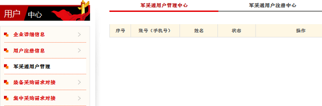 认证用户通过U盾登录网站后,进入“用户中心-军采通用户管理”栏目,可对本单位军采通用户进行管理。