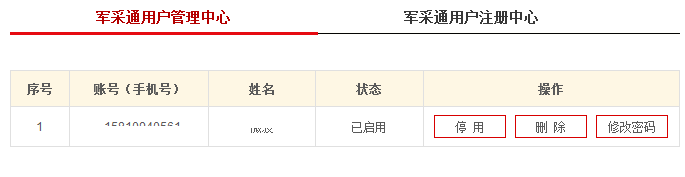 认证用户U盾登录后,可在“用户中心-军采通用户管理-军采通用户管理中心”对本单位注册的军采通用户进行停用/启用、删除、修改密码等操作。