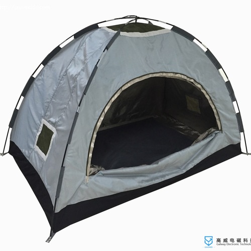 单人电磁屏蔽帐篷具有显著的防电磁信息泄漏、防电磁干扰、防红外成像等功能,具有重量轻、易携带、展开和收拢便捷等特点。 单人电磁屏蔽帐篷主要由折叠式撑杆支架、电磁屏蔽帐篷篷身、波导通风窗、电源滤波器、篷内部件等组成。篷身采用一种自主研发的高性能软体电磁屏蔽复合织物材料制作而成;支架采用能快速展开、撤收的撑杆式支架结构。