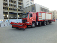 综合除雪车以汽车底盘为载体,集铲雪、强力扫雪、破冰和清雪功能于一体的纯机械式除雪车辆,既能快速清除未压实积雪,又能有效清除压实雪和坚冰,除冰雪效果好,除净率高,是目前国内最先进的机械式综合除冰雪车。整机主要包括:汽车底盘、机架总成、辅助发动机、前置除雪铲、中置破冰辊、中置扫雪刷、后置吹雪机、液压系统、电气系统等。