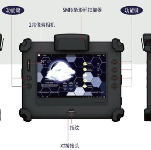 产品特征: ★IP65,6英尺安全跌落,坚固设计 ★支持宽温工作-20℃~50℃ ★运用增亮技术使阳光下可视 ★热替换双电池可持续8小时 ★支持RJ45网口、WIFI、蓝牙、GPRS、3G等通讯功能 ★双摄像头设计,图片、视频采集更方便