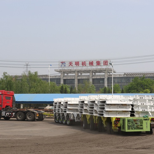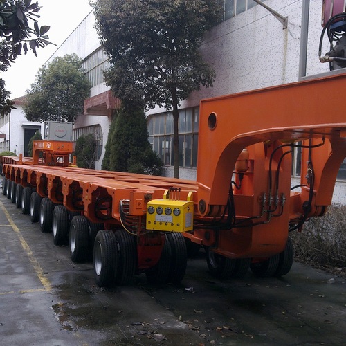 牵引式多轴线模块车由活络端梁、单元车和纵横向联接部件等组成,在结构上采用平板网络单箱形主梁的车架,215/75R17.2小轮胎液压悬挂三点或四点支撑;采用液压全轮牵引转向或控制转向,双管路全轮制动,具有货台高度低、轮轴负荷均匀、转弯半径小、狭小场地通过性好、倒车方便等特点,货台高度可调节,具有自装自卸能力,在上下坡道及斜坡上行驶可调整车身,保证载货平稳可靠安全。用户可根据货场不同的重量和长度、宽度进行相应的组合。配用定制的活络鹅颈、转盘或凹形模块,可组合为各种需要的特性运输车,满足超长、超高、超大不可拆卸的大型物件运输。