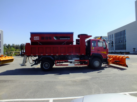 AD5165TCX型除雪车能快速清除冰雪,保证道路交通安全畅通,是您冬雪时节的好伙伴,它具有与众不同的功能:除雪速度快、撒布均匀、撒布量和撒布宽度随时可调。撒布宽度:3—15m,最大15m;撒布量:10—80g/m2最大80g/m2。除雪与撒布即可单独作业又可同时进行。夏季换上水罐后即可当洒水车使用、也可做护拦板清洗用。前置扫雪滚刷主要用于清扫100mm以下的新降浮雪,一般应安装于载质量8吨以上的汽车前部或装载机前部。除雪铲是由特殊曲线的板面及支承架组成的,能将路面积雪推出路面以外,除雪铲可随着路面的高低起伏变化而变化,以达到紧贴路面清净积雪的目的.