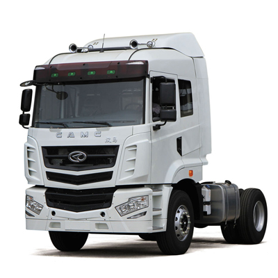 (1)总重18—55吨的重型牵引;(2)驾驶室采用流线性设计,风阻系数0.52,一阶模态32.5Hz,远高于行业同类车型,安全性能达到欧洲ECE R29标准要求;(3)发动机电控喷油系统、自动变速器AT、电控空气悬架ECAS、CAN/LIN总线系统、ABS、ASR等汽车电子技术自主开发匹配;(4)底盘采用变截面梯形双层纵梁式承载车架,可降低整车重心和提高转弯稳定性;梯形平衡空气悬架,保证了整车的高速稳定性和平顺性;采用一种可变轴距的双前桥转向传动机构,解决了多种轴距、同步转向等需求;采用行车气动保护回路装置、盘式制动器和胎压监控系统,提高整车主动安全性。