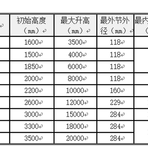 常用规格: 型 号 节数 初始高度(mm) 最大升高(mm) 最外节外径(mm) 最内节内径(mm) 负载(Kg) 桅杆自重(Kg) T3-110-1600-3500 3 1600 3500 118 75 110 18 T4-110-1500-4000 4 1500 4000 118 60 72 19 T4-110-1850-6000 4 1850 6000 118 25 T5-110-2000-8000 5 2000 8000 118 46 40 34 T6-150-2200-10000 6 2200 10000 160 60 72 59