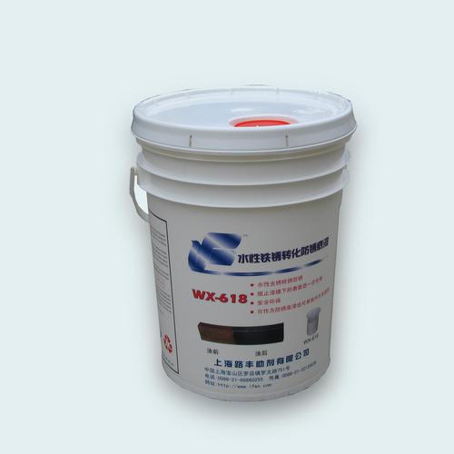 采用改性的水性丙烯酸树脂与复合转化剂搭配的新一代水性铁锈转化产品,产品为白色乳状液,涂于铁锈表面后转化为黑色有机铁高分子化合物,其对基体附着力、防腐性、与其它涂层的层间附着力等综合性能优良,完全能替代喷砂、抛丸的涂装前处理工艺,经过常州国家涂料质量监督检验中心测试,其对锈蚀的转化层经养护后盐雾试验时间达72小时(GB/T 1771-91),3%盐水浸泡时间达168小时(GB/T9274-88甲法),好于一般的防腐底漆