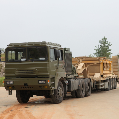 60t装备运输列车主要用于四级(含)以上公路、、急造军路上运输总重60吨以内的重型履带式车辆、轮式车辆、20英尺货运集装箱及其它工程装备等,具有牵引总重60吨以内因受损或故障而抛锚的重型履带式、轮式及其它工程车辆上下半挂车平台的能力。采用高断面工字梁结构型式、新型高强度材料车架,在越野行驶过程能确保承载能力大、安全可靠。挂车采用14t整体式车桥,前两桥承载,后两桥为随动转向桥。在车辆曲线行驶时,车轮受侧向力作用,将自动顺着曲线方向转向,提高整车转向性能。 制动系统带ABS系统,能够合理分配制动力,提高车辆制动稳定性、机动性和安全性。设有一套导轮装置和液压绞盘,方便牵引或卸下受损重型装备。
