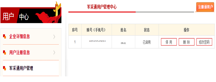 全军武器装备采购信息网企事业单位认证用户通过U盾登录网站后,进入“用户中心-军采通用户管理”界面,可为本单位员工注册”军采通”账户,并对账户进行启用/停用、删除、修改密码等管理。