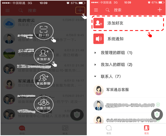 “军采通”为用户提供了丰富的添加好友功能。用户可点击“密信”或“密友”界面右上角的“+”,选择【添加好友】或【扫一扫】添加好友;可以直接选择“密友”界面的【添加好友】;还可以通过搜索手机号码、密信号、姓名添加好友。