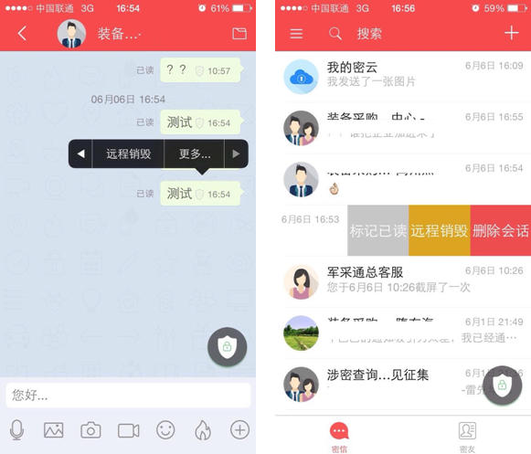 “军采通”在安全模式下,可提供端到端加密安全通信;在非安全模式下,将自动关闭通信功能,并隐藏通信信息。相关操作如下: