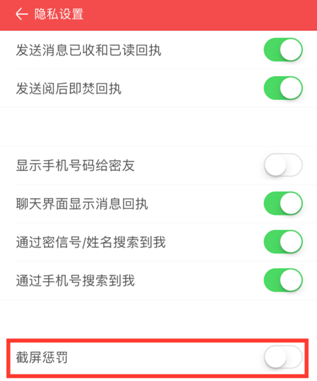 (1)个人用户可在“设置-隐私设置”中开启/关闭“截屏惩罚”。“截屏惩罚”开启,会话时若对方截屏,对方收到的消息将强制清空。