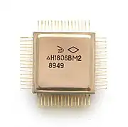 - N1806VM2: functionally equivalent to the nMOS K1801VM2; clock speed 5 MHz; 64-pin CQFP; 134636 transistors; manufactured by Fizika Moscow as a second source[8][9][10][11]