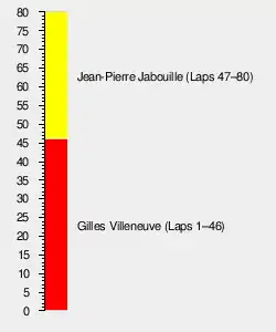 The race featured one of the fiercest battles ever for second place, between Ferrari driver Gilles Villeneuve and Renault driver René Arnoux, who on several occasions during the final laps touched wheels and swapped positions. The fight is often cited as one of the most memorable pieces of racing in Formula One.[1] Villeneuve, who passed the finish line less than a quarter of a second ahead of Arnoux, later described the occasion as "my best memory of Grand Prix racing".[2]