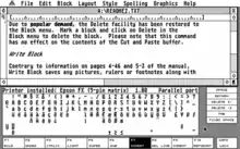 The text-mode display on the ST had a number of limitations. While it could display italics, it did not directly support superscripts or subscripts, or underlining. 1st Word could display underlining, but this did not follow the text during typing and only updated during a reformat. Nor was text layout as-you-type, fixing word wrapping and paragraph and page layout also occurred only during a reformat run, triggered through a menu command.[1] The program used block-mode selections using the mouse as the basis for most editing, including cut-and-paste and similar changes. It also included the ability to save a selection to a file or load it from a file, allowing documents to easily include boilerplate text. It included search and replace as well as the ability to place up to four markers within the program that could be quickly accessed from the menu, scrolling the document to that point.[1]