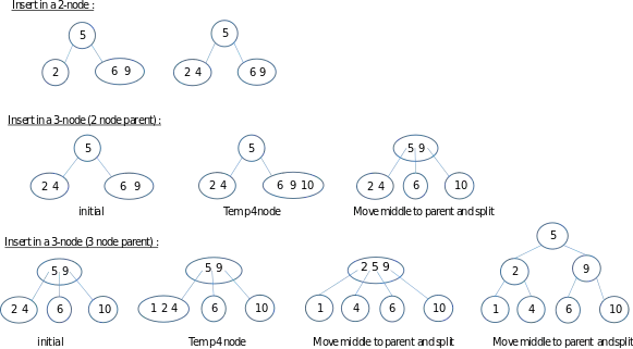 To insert into a 3-node, more work may be required depending on the location of the 3-node. If the tree consists only of a 3-node, the node is split into three 2-nodes with the appropriate keys and children.