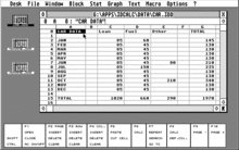 The spreadsheet contains 13 pages of 2048 rows and 256 columns. Cells of different pages could be cross-referenced. 3D Calc offers a GEM based user interface with icons, menus and function keys. Users can work on three spreadsheets at the same time with up to three GEM windows for each. The application supports on-screen help via the "?" menu[2] and can import data from Lotus 1-2-3 (with some limitations).[3]: 10