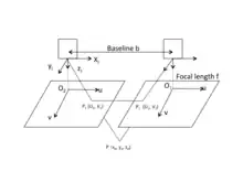 The approach of using Binocular stereo vision to acquire object's 3D geometric information is on the basis of visual disparity.[19] The following picture provides a simple schematic diagram of horizontally sighted Binocular Stereo Vision, where b is the baseline between projective centers of two cameras.