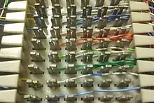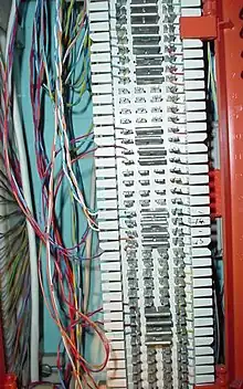 A 66 block is a type of punch-down block used to connect sets of wires in a telephone system. They have been manufactured in four common configurations, A, B, E and M.[lower-alpha 1] A and B styles have the clip rows on 0.25" centers while E and M have the clip rows on 0.20" centers. The A blocks have 25 slotted holes on the left side for position the incoming building cable with a 50 slot fanning strip on the right side for distribution cables. They have been obsolete for many years. The B & M styles have 50 slot fanning strip on both sides. The B style is used mainly in distribution panels where several destinations (often 1A2 key telephones) need to connect to the same source. The M blocks are often used to connect a single instrument to such a distribution block. The E style has 5 columns of 10 2 clips rows and are used for transitioning from the 25 pair distribution cable to a 25 pair RJ21 style female ribbon connector.