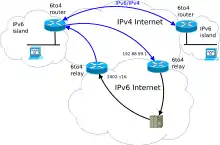 To allow hosts and networks using 6to4 addresses to exchange traffic with hosts using "native" IPv6 addresses, "relay routers" have been established. A relay router connects to an IPv4 network and an IPv6 network. 6to4 packets arriving on an IPv4 interface will have their IPv6 payloads routed to the IPv6 network, while packets arriving on the IPv6 interface with a destination address prefix of 2002::/16 will be encapsulated and forwarded over the IPv4 network.