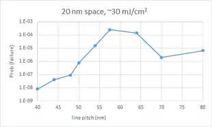 EUV also has issues with reliably printing all features in a large population; some contacts may be completely missing or lines bridged. These are known as stochastic printing failures.[60][61] The defect level is on the order of 1K/mm2.[62]