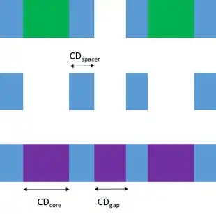 Spacer patterning involves depositing a layer onto pre-patterned features, then etching back to form spacers on the sidewalls of those features, referred to as core features. After removing the core features, the spacers are used as an etch mask to define trenches in the underlying layer. While the spacer CD control is generally excellent, the trench CD may fall into one of two populations, due to the two possibilities of being located where a core feature was located or in the remaining gap. This is known as 'pitch walking'.[54] Generally pitch = core CD + gap CD + 2 * spacer CD, but this does not guarantee core CD = gap CD. For FEOL features like gate or active area isolation (e.g., fins), the trench CD is not as critical as the spacer-defined CD, in which case, spacer patterning is actually the preferred patterning approach.