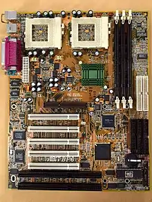 The ABIT BP6 was an ATX motherboard released by ABIT in 1999. It was the first motherboard to allow the use of two unmodified Intel Celeron processors in dual Symmetric multiprocessing (SMP) configuration. This combined with its overclocking capabilities made it a popular option among computer enthusiasts.[1] The BP6 has been credited as the product that made multi-processor systems affordable for mainstream users,[2] because prior to its release the expense of any multi-processor configuration made it a feature only to be considered for workstation-class systems.