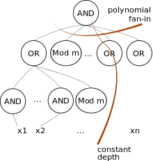 More formally, a language belongs to AC0[m] if it can be computed by a family of circuits C1, C2, ..., where Cn takes n inputs, the depth of every circuit is constant, the size of Cn is a polynomial function of n, and the circuit uses the following gates: AND gates and OR gates of unbounded fan-in, computing the conjunction and disjunction of their inputs; NOT gates computing the negation of their single input; and unbounded fan-in MOD-m gates, which compute 1 if the number of input 1s is a multiple of m. A language belongs to ACC0 if it belongs to AC0[m] for some m.