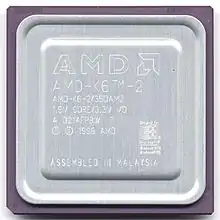 The K6-2 is an x86 microprocessor introduced by AMD on May 28, 1998,[2] and available in speeds ranging from 266 to 550 MHz. An enhancement of the original K6, the K6-2 introduced AMD's 3DNow! SIMD instruction set and an upgraded system-bus interface called Super Socket 7, which was backward compatible with older Socket 7 motherboards. It was manufactured using a 250 nanometer process, ran at 2.2 volts, and had 9.3 million transistors.