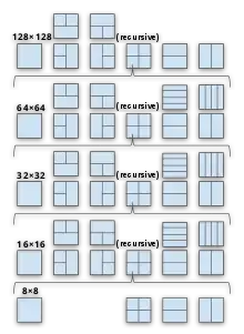 Frame content is separated into adjacent same-sized blocks referred to as superblocks. Similar to the concept of a macroblock, superblocks are square-shaped and can either be of size 128×128 or 64×64 pixels. Superblocks can be divided in smaller blocks according to different partitioning patterns. The four-way split pattern is the only pattern whose partitions can be recursively subdivided. This allows superblocks to be divided into partitions as small as 4×4 pixels.