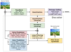 There is also the loop restoration filter (loop_restoration) based on the Wiener filter and self-guided restoration filters to remove blur artifacts due to block processing.[42]