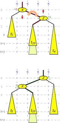 If the balance factor temporarily becomes ±2, this has to be repaired by an appropriate rotation. It depends on the balance factor of the sibling Z (the higher child tree in figure 2) whether the height of the subtree decreases by one –and the retracing needs to continue– or does not change (if Z has the balance factor 0) and the whole tree is in AVL-shape.