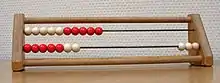 The red-and-white abacus is used in contemporary primary schools for a wide range of number-related lessons. The twenty bead version, referred to by its Dutch name rekenrek ("calculating frame"), is often used, either on a string of beads or on a rigid framework.[52]