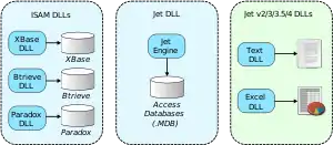 Jet 2.0 was released as several dynamic linked libraries (DLL's) that were utilized by application software, such as Microsoft's Access database. DLL's in Windows are "libraries" of common code that can be used by more than one application—by keeping code that more than one application uses under a common library which each of these applications can use independently code maintenance is reduced and the functionality of applications increases, with less development effort. Jet 2.0 comprised three DLL's: the Jet DLL, the Data Access Objects (DAO) DLL and several external ISAM DLL's. The Jet DLL determined what sort of database it was accessing, and how to perform what was requested of it. If the data source was an MDB file (a Microsoft Access format) then it would directly read and write the data to the file. If the data source was external, then it would call on the correct ODBC driver to perform its request. The DAO DLL was a component that programmers could use to interface with the Jet engine, and was mainly used by Visual Basic and Access Basic programmers. The ISAM DLL's were a set of modules that allowed Jet to access three ISAM based databases: xBase, Paradox and Btrieve. Jet 2.0 was replaced with Jet 2.1, which used the same database structure but different locking strategies, making it incompatible with Jet 2.0.