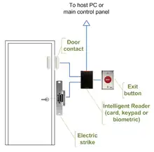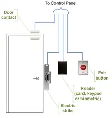 - Locking hardware, such as electric door strikes and electromagnetic locks