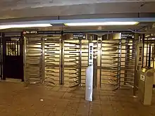 Geographical access control may be enforced by personnel (e.g. border guard, bouncer, ticket checker), or with a device such as a turnstile. There may be fences to avoid circumventing this access control. An alternative of access control in the strict sense (physically controlling access itself) is a system of checking authorized presence, see e.g. Ticket controller (transportation). A variant is exit control, e.g. of a shop (checkout) or a country.[3]