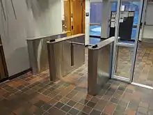 - An access-controlled entry, such as a door, turnstile, parking gate, elevator, or other physical barrier