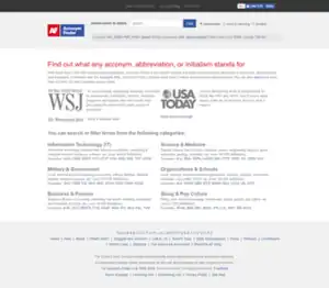 The website contains a database of meanings and expansions for abbreviations, acronyms, initialisms mainly in English but includes some entries in other languages such as French, German, Spanish etc. as well.[8] It is freely accessible. The entries are further classified into categories such as Information Technology, Military/Government, Science, Slang/Pop Culture etc. It also contains a database of US and Canadian postal codes which are shown on a Map along with location information.[9] Abbreviations with multiple expansions are listed by popularity with the most common one being presented first, these can be sorted alphabetically as well.[10][11]