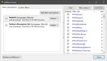 As of 2015, many web browsers block unsolicited pop-up ads automatically. Current versions of Konqueror,[43] Microsoft Edge,[44] and Firefox[45][46] also include content filtering support out-of-the-box. Content filtering can be added to Firefox, Chromium-based browsers, Opera, Safari, and other browsers with extensions such as AdBlock, Adblock Plus, and uBlock Origin, and a number of sources provide regularly updated filter lists. Adblock Plus is included in the freeware browser Maxthon from the People's Republic of China by default.[47]