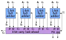 To reduce the computation time, engineers devised faster ways to add two binary numbers by using carry-lookahead adders (CLA). They work by creating two signals ( and ) for each bit position, based on whether a carry is propagated through from a less significant bit position (at least one input is a 1), generated in that bit position (both inputs are 1), or killed in that bit position (both inputs are 0). In most cases, is simply the sum output of a half adder and is the carry output of the same adder. After and are generated, the carries for every bit position are created. Some advanced carry-lookahead architectures are the Manchester carry chain, Brent–Kung adder (BKA),[8] and the Kogge–Stone adder (KSA).[9][10]