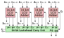 By combining multiple carry-lookahead adders, even larger adders can be created. This can be used at multiple levels to make even larger adders. For example, the following adder is a 64-bit adder that uses four 16-bit CLAs with two levels of lookahead carry units.
