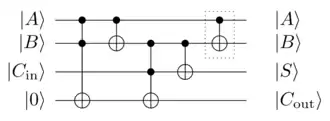 Using only the Toffoli and CNOT quantum logic gates, it is possible to produce quantum full- and half-adders.[11][12][13] The same circuits can also be implemented in classical reversible computation, as both CNOT and Toffoli are also classical logic gates.