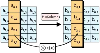 During this operation, each column is transformed using a fixed matrix (matrix left-multiplied by column gives new value of column in the state):
