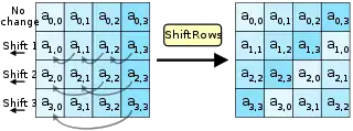 - ShiftRows – a transposition step where the last three rows of the state are shifted cyclically a certain number of steps.