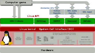 | Kernel mode | Linux kernel | stat, splice, dup, read, open, ioctl, write, mmap, close, exit, etc. (about 380 system calls)The Linux kernel System Call Interface (SCI), aims to be POSIX/SUS-compatible[1] | ||||