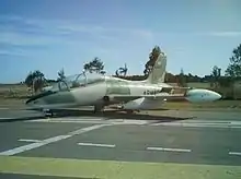 The MB-339 possesses a low, un-swept wing complete with tip tanks; the air intakes for the single turbojet engine is located within the wing roots.[15] This wing is identical to that used on the older MB-326K model.[2] The powerplant used for the aircraft's initial versions was the Rolls-Royce Viper 632-43 turbojet engine, which was capable of producing a maximum thrust of 4,000 lbf (17.8 kN); this is the same model as installed upon the older MB-326K model. Later models, such as the MB-339C, are furnished with the more powerful Viper 680 engine, which can generate up to 4,300 lbf (19.57 kN) of thrust.[2] For improved aerodynamics, the MB-339 features an enlarged tailfin over its predecessor.[15]
