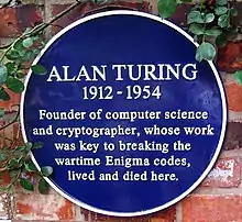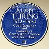 Turing's father's civil service commission was still active during Turing's childhood years, and his parents travelled between Hastings in the United Kingdom[26] and India, leaving their two sons to stay with a retired Army couple. At Hastings, Turing stayed at Baston Lodge, Upper Maze Hill, St Leonards-on-Sea, now marked with a blue plaque.[27] The plaque was unveiled on 23 June 2012, the centenary of Turing's birth.[28]