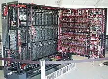 In July 1942, Turing devised a technique termed Turingery (or jokingly Turingismus[119]) for use against the Lorenz cipher messages produced by the Germans' new Geheimschreiber (secret writer) machine. This was a teleprinter rotor cipher attachment codenamed Tunny at Bletchley Park. Turingery was a method of wheel-breaking, i.e., a procedure for working out the cam settings of Tunny's wheels.[120] He also introduced the Tunny team to Tommy Flowers who, under the guidance of Max Newman, went on to build the Colossus computer, the world's first programmable digital electronic computer, which replaced a simpler prior machine (the Heath Robinson), and whose superior speed allowed the statistical decryption techniques to be applied usefully to the messages.[121] Some have mistakenly said that Turing was a key figure in the design of the Colossus computer. Turingery and the statistical approach of Banburismus undoubtedly fed into the thinking about cryptanalysis of the Lorenz cipher,[122][123] but he was not directly involved in the Colossus development.[124]