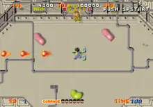 Two players control two soldiers, named Ricky and Mary, who fight their way through large eight-way scrolling levels while rescuing their comrades who are being held by aliens. At the beginning of each level, a time bomb is set onboard the infested ship, the players must complete their task before time runs out and the ship is destroyed. After they have rescued a certain number of hostages, the exit opens and they can pass through it in order to fight the end-of-level guardian. If this monstrosity is defeated before times runs out, they are then able to move onto the next stage. Once all seven levels are completed, the game starts over again with more aggressive aliens, and less time on the countdown to complete the levels. Alien Syndrome features two player simultaneous gameplay and pickups which assist the player, including better weapons and maps of the current level.