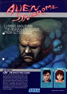 Alien Syndrome (エイリアンシンドローム, Eirian Shindorōmu) is a run and gun video game developed by Sega and released in arcades in 1987, and later ported to the Master System in 1988. The game utilizes a side-scrolling feature that allows the player to take control of either a male (Ricky) or female (Mary) soldier whilst hunting aliens and saving hostages before they run out of time.